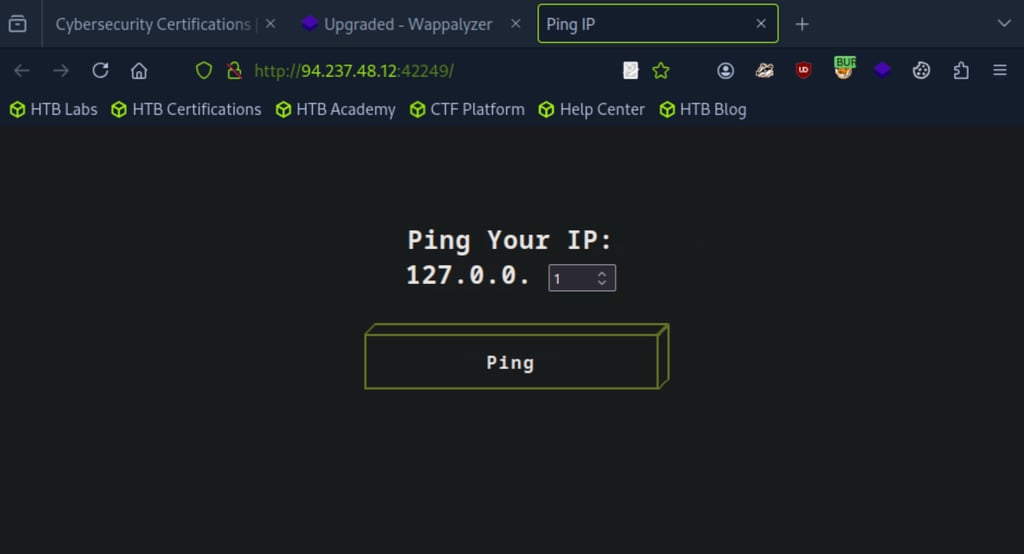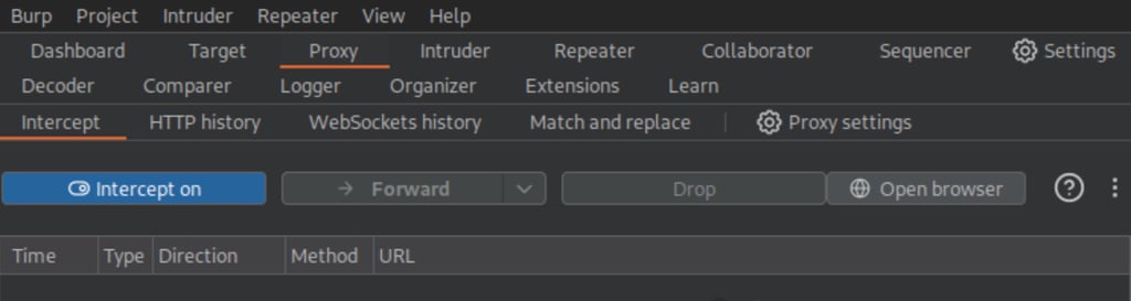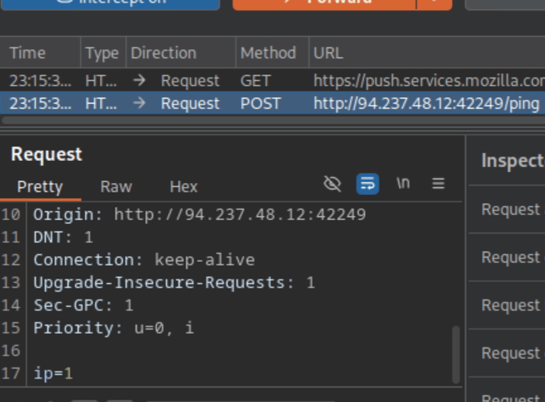 📌 Why? If it’s on while you load the target website, the page won’t load properly because Burp will intercept the request before it reaches the server. We’ll turn it on later when we’re ready to capture a specific request (like our ping input).