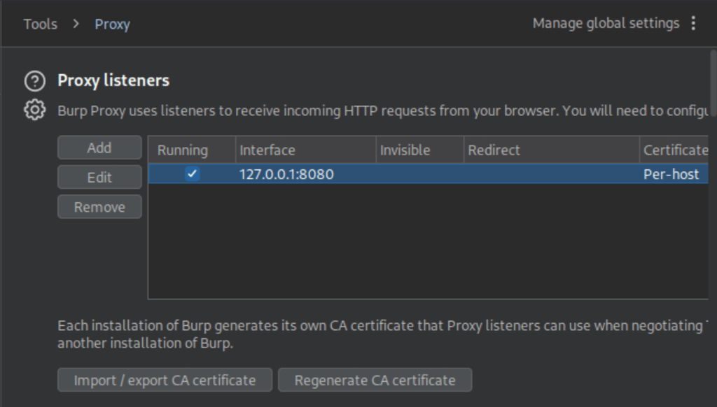 This means Burp Suite is listening for incoming HTTP requests from your browser on localhost (127.0.0.1) using port 8080.