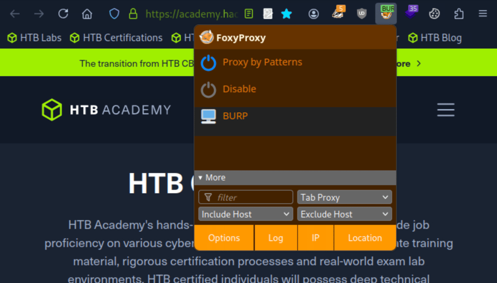 First, we will open our browser and activate Foxyproxy>Proxy by patterns, then navigate to your target ip: http://<target ip>/
