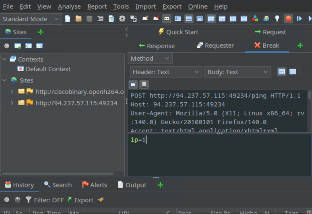 Now, go back and repeat the ping request one more time — but this time, change ip=1 to ip=;cat flag.txt;. This command will read and display the contents of the flag.txt file, allowing us to capture the flag.