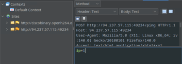 Just like we did previously with Burp, change ip=1 to ip=;ls; then click step and toggle the intercept button off (green=off).