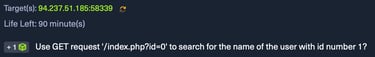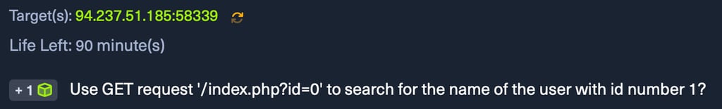 Objective: Use GET request '/index.php?id=0' to search for the name of the user with id number 1?
