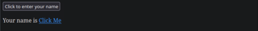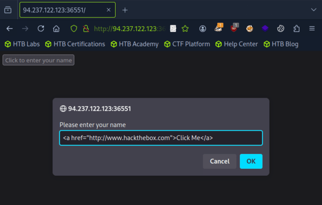 Objective: What text would be displayed on the page if we use the following payload as our input: <a href="http://www.hackthebox.com">Click Me</a>