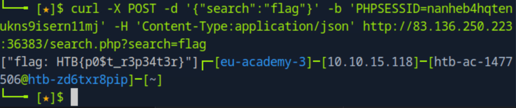 curl -X POST -d '{"search":"flag"}' -b 'PHPSESSID=nanheb4hqtenukns9isern11mj' -H 'Content-Type:application/json' http://<target ip>/search.php?search=flag