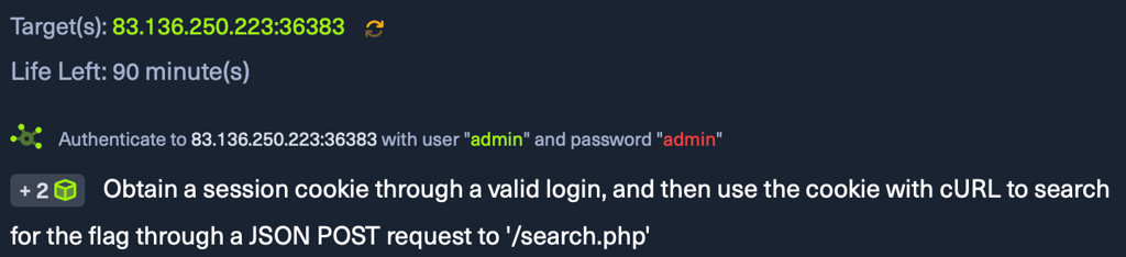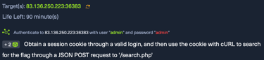 Objective: Obtain a session cookie through a valid login, and then use the cookie with cURL to search for the flag through a JSON POST request to '/search.php'